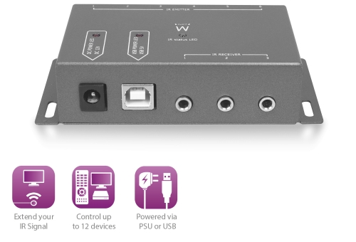 O Kit Extensor de IV EW1580 é alimentado através do adaptador de corrente de 12V fornecido. Além disso, o extensor pode ser alimentado através de USB de 5V. O cabo de alimentação USB não é fornecido. O extensor possui um suporte de montagem integrado.