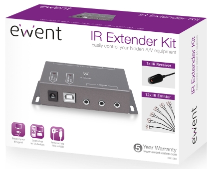 - Kit Extensor de IV para aumentar o alcance do sinal de infravermelhos e controlar até 12 dispositivos de A/V guardados num armário fechado