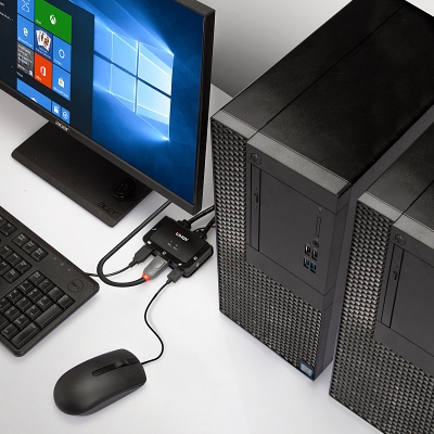 Support for resolutions up to 4K Ultra HD 60Hz ensures the optimum image quality, perfect for high graphical content in gaming setups, video editing or dual system control workstations. The audio output port on the main unit also allow users to connect headphones or speaker to add immersive 2CH audio and a microphone, while additional USB peripherals can be integrated with a USB hub.